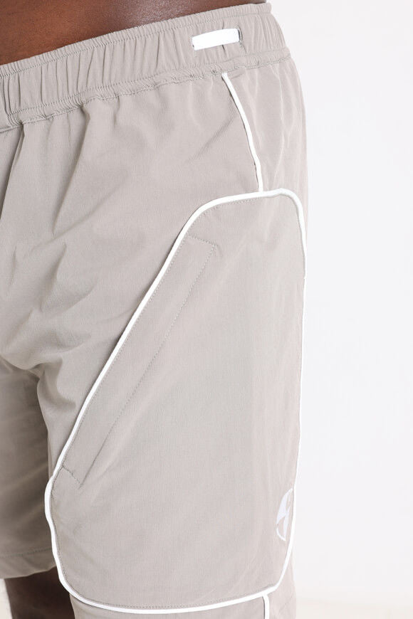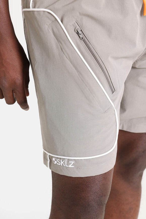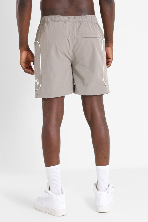 Grey sweat shorts, mesh lined with front zipped pockets and a back flap pocket.