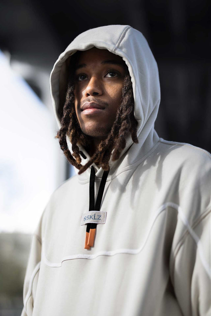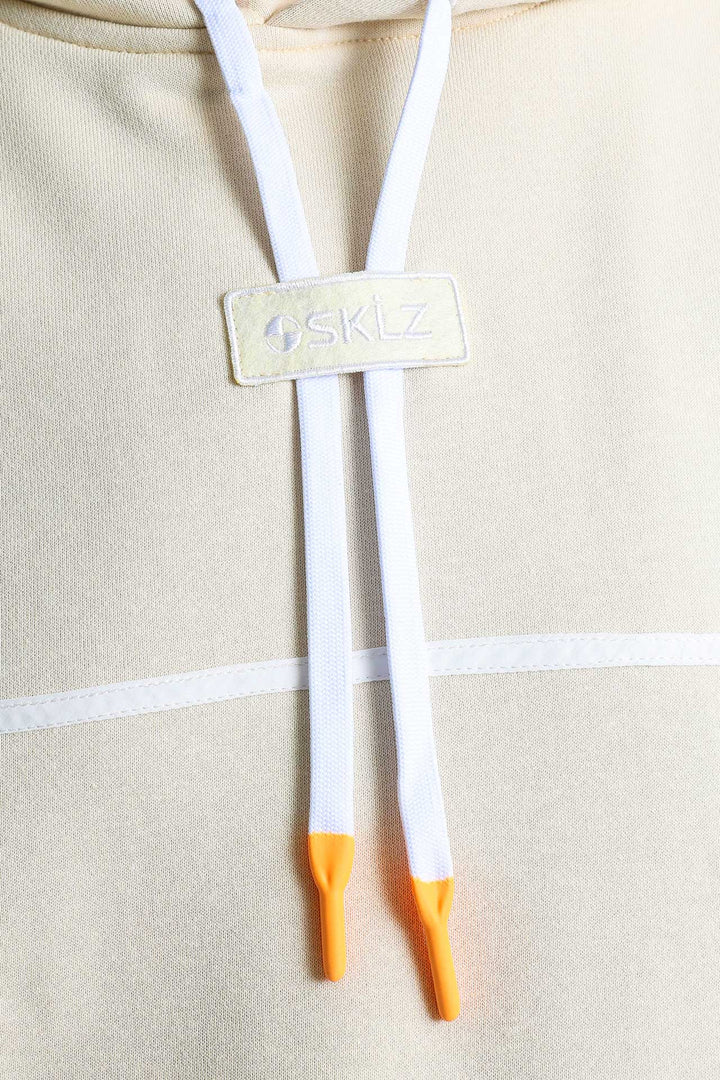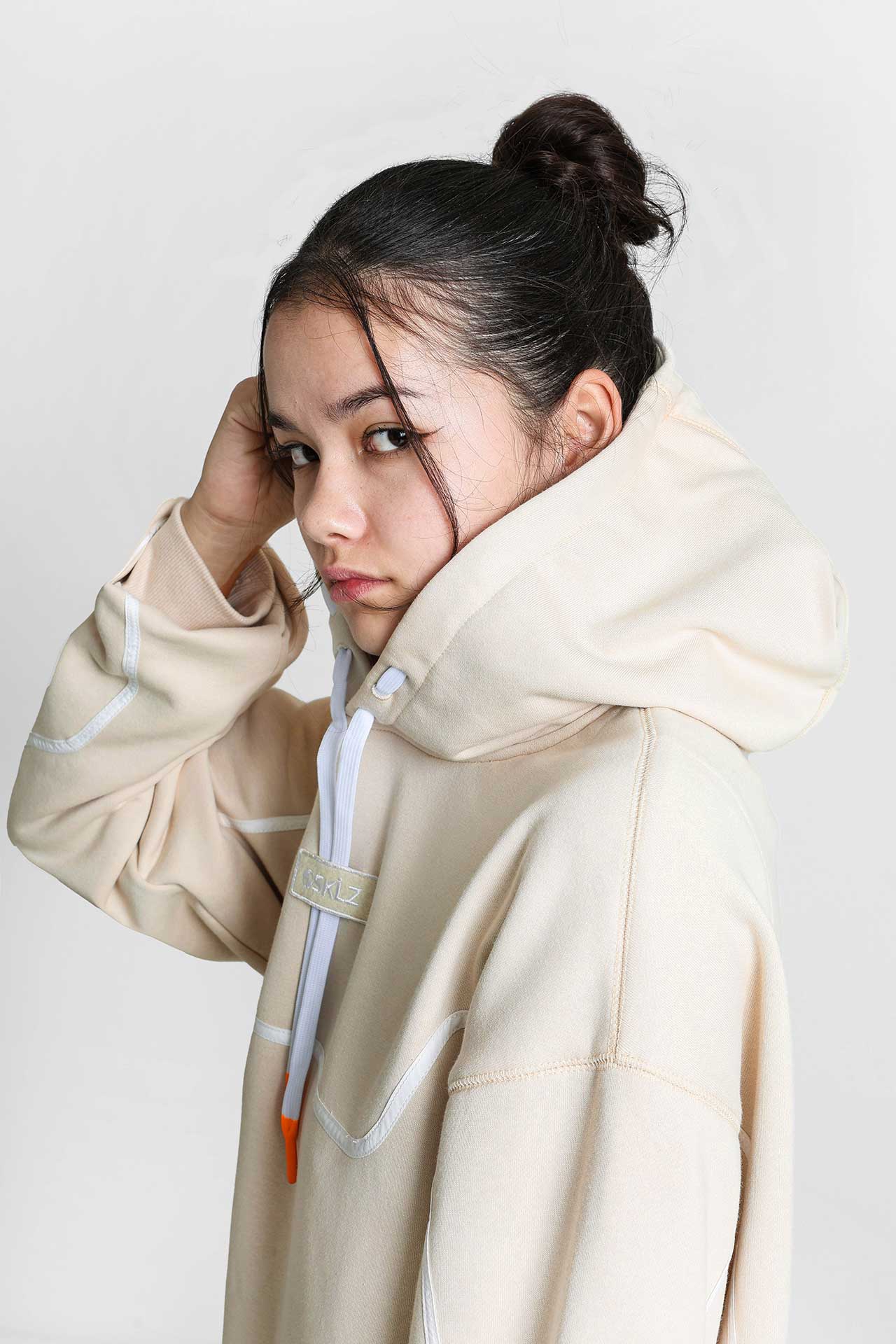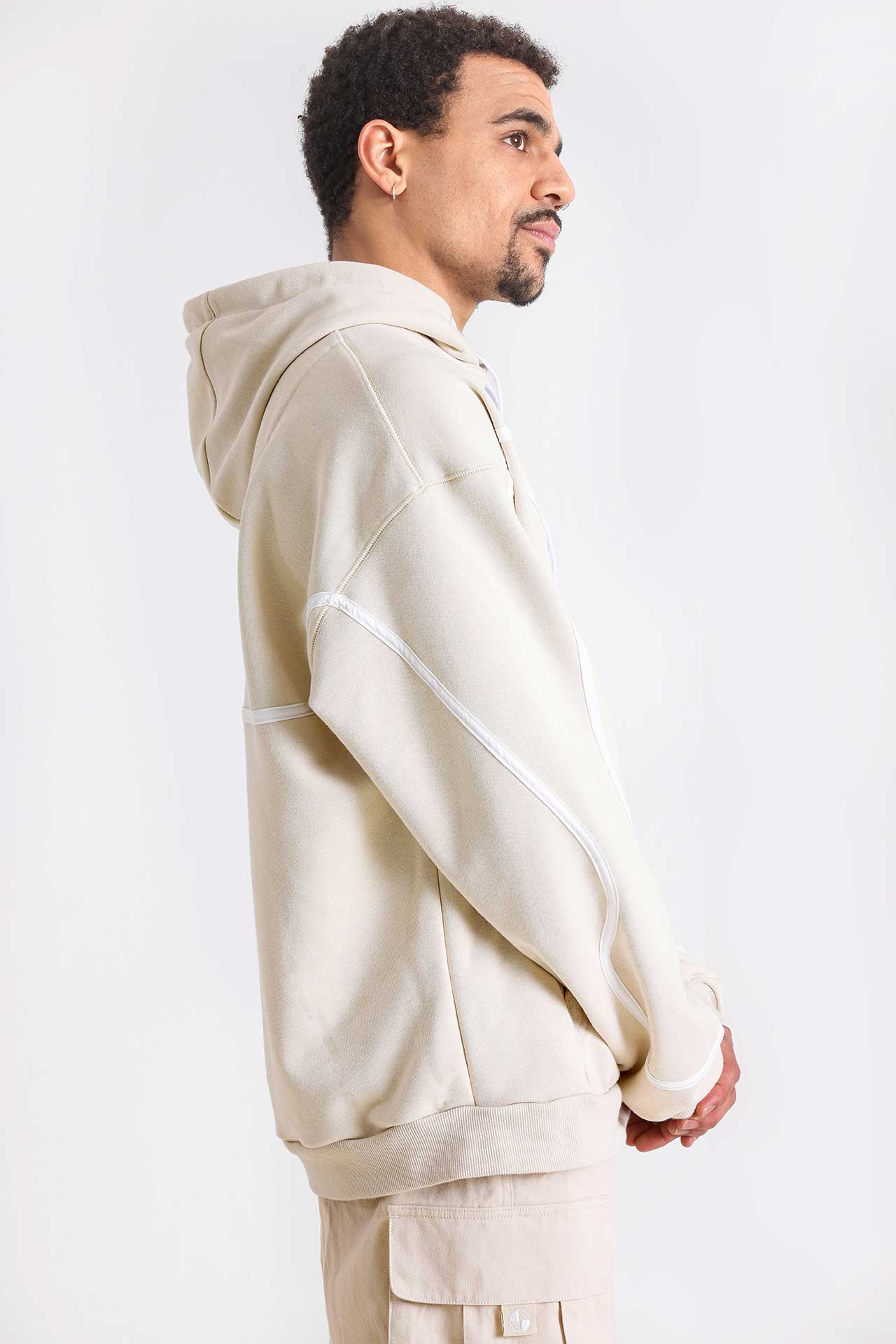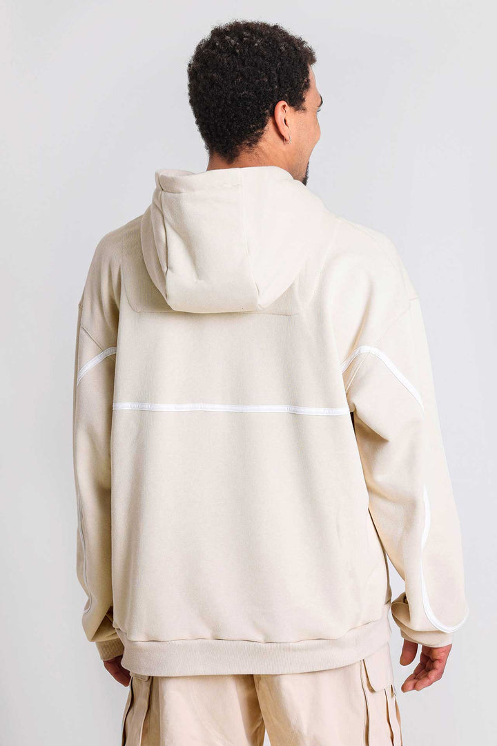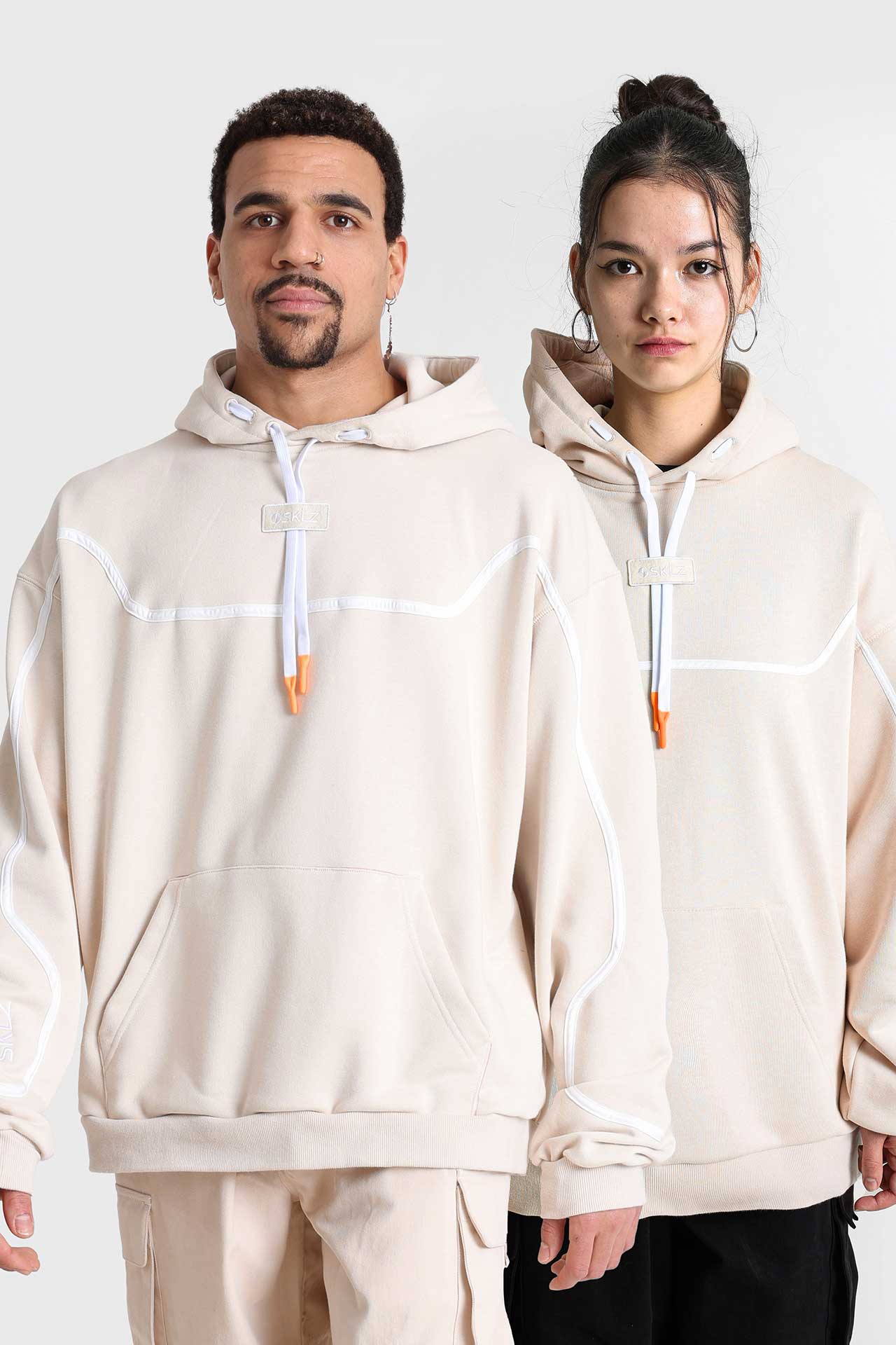 Beige hooded sweatshirt with a kangaroo pocket on the front.