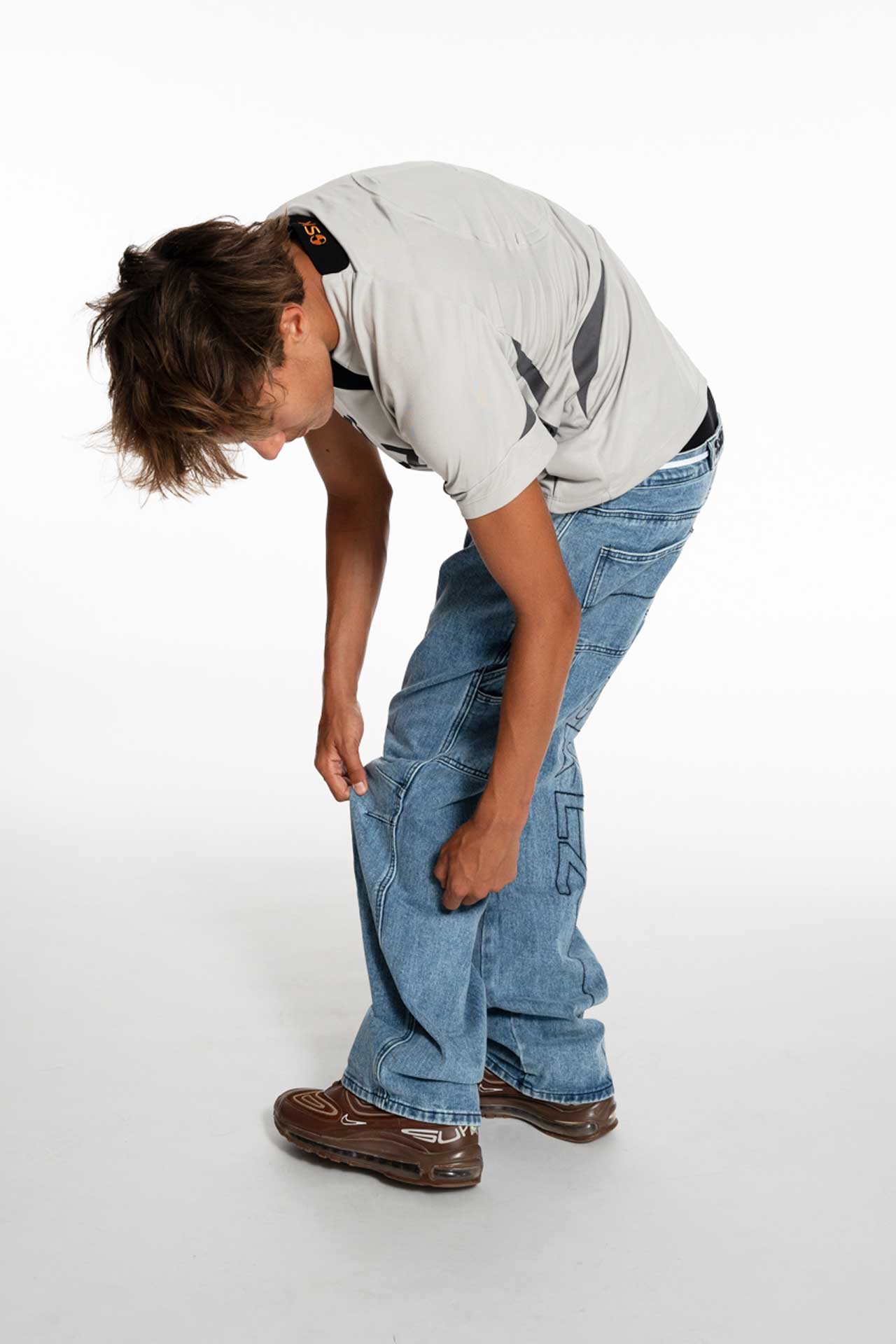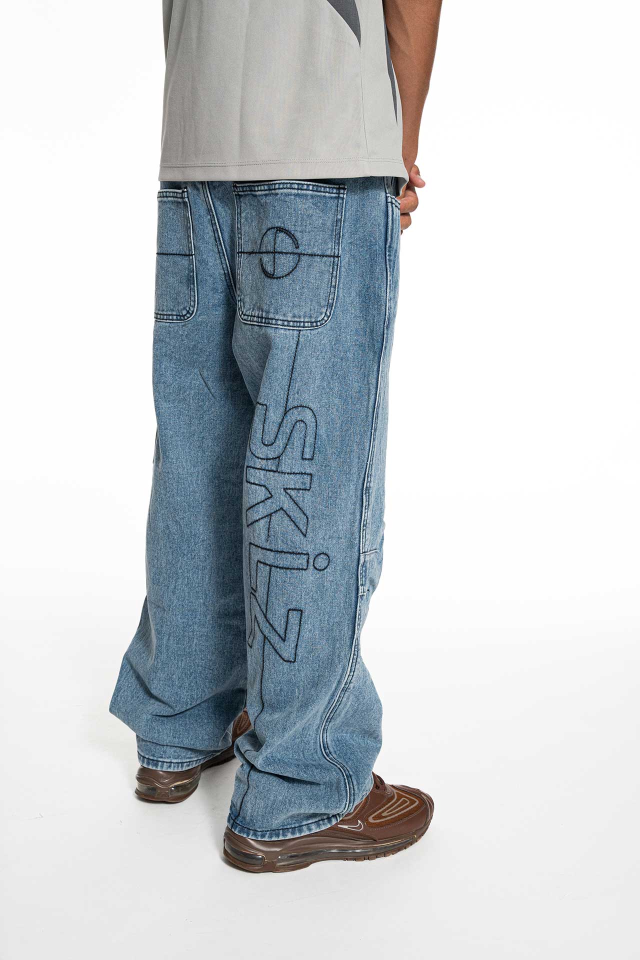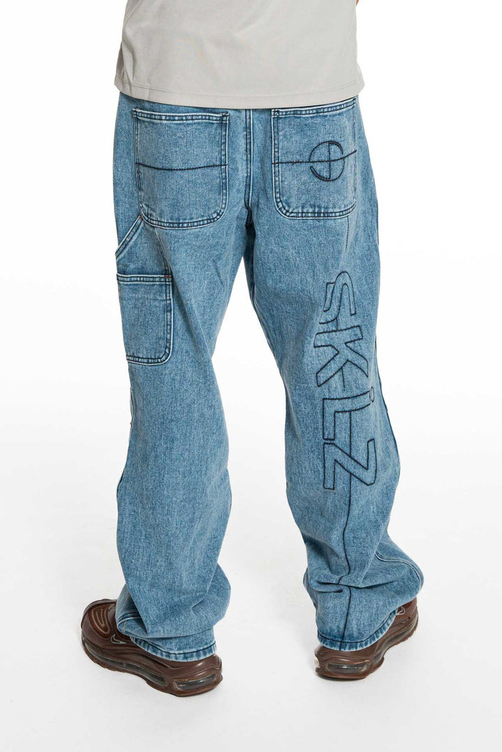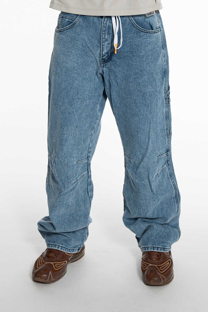 Jean droit en denim bleu avec coupe ample, conçu pour faciliter le mouvement grâce aux pinces situées au niveau des genoux.