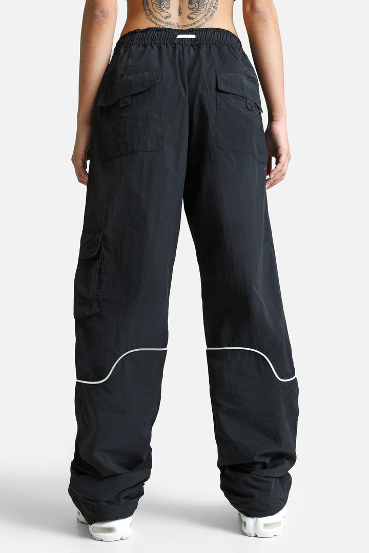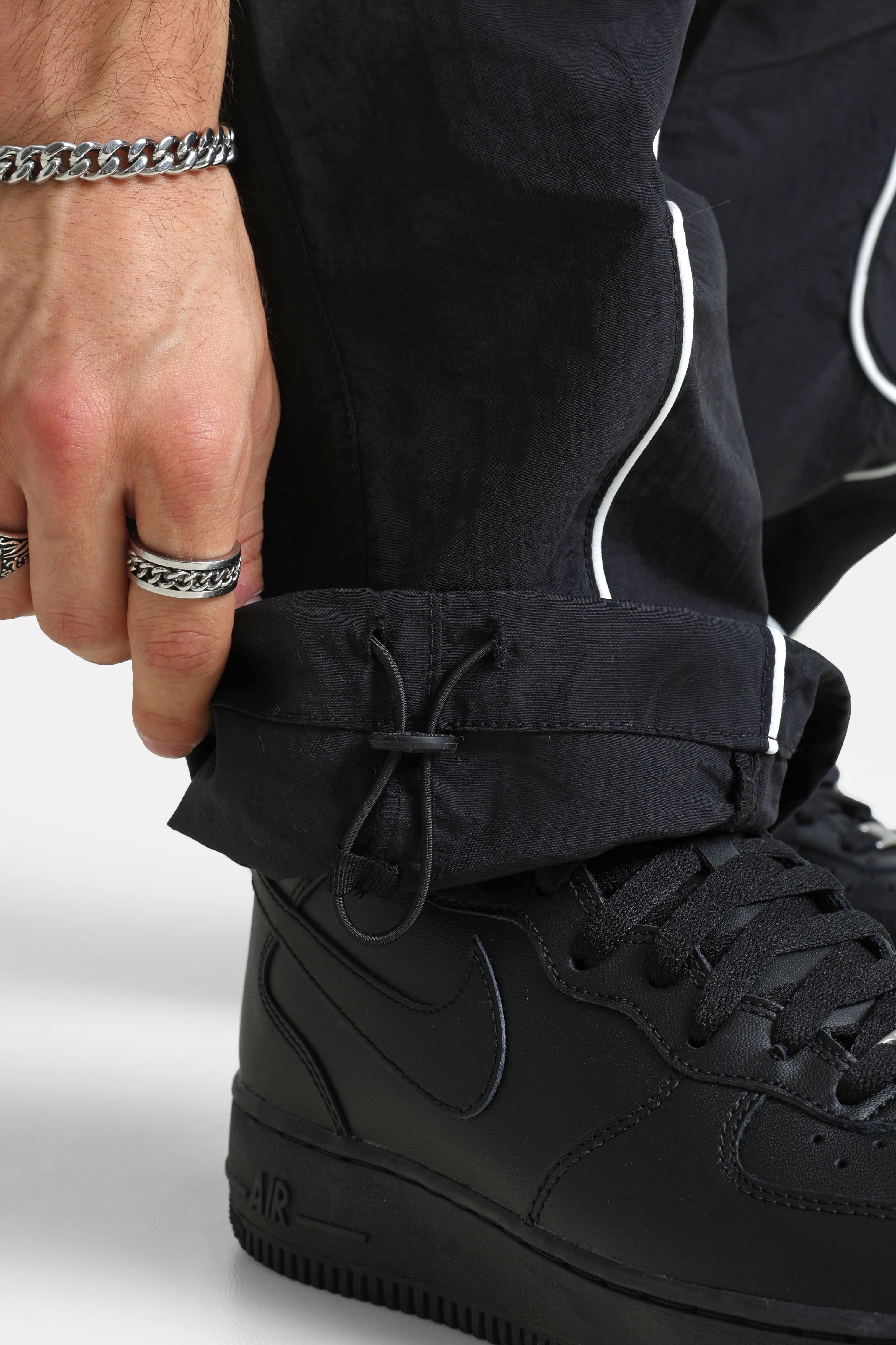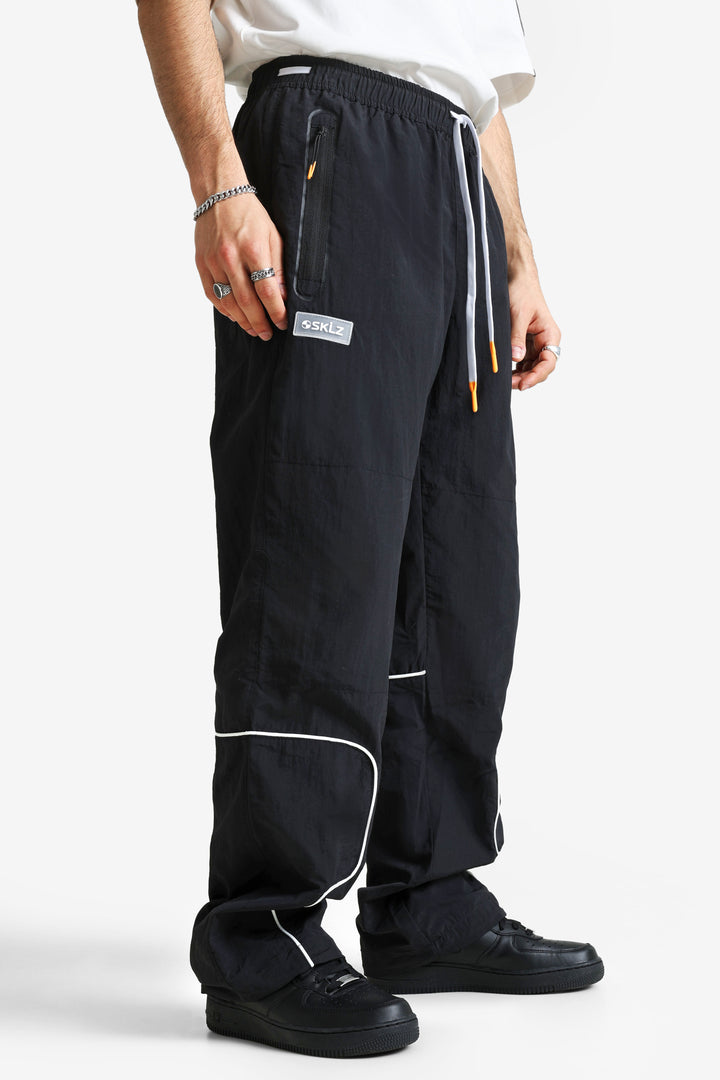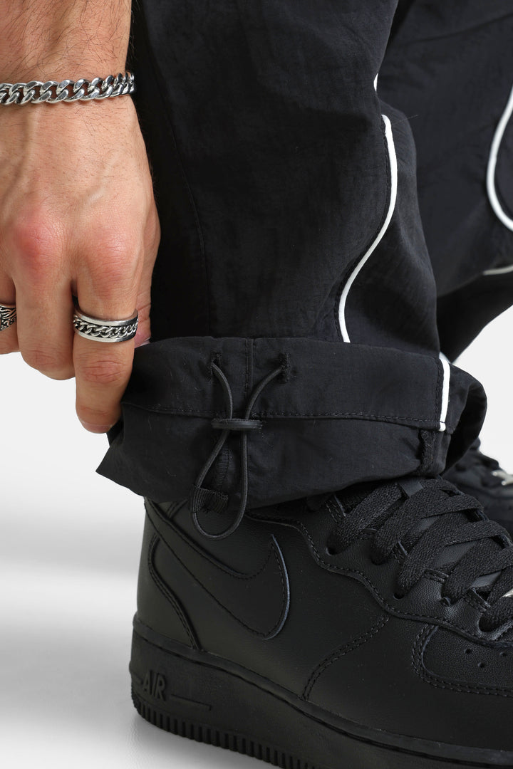 Pantalon de survêtement noir avec lacet de serrage à la taille et cordons de serrage aux chevilles.