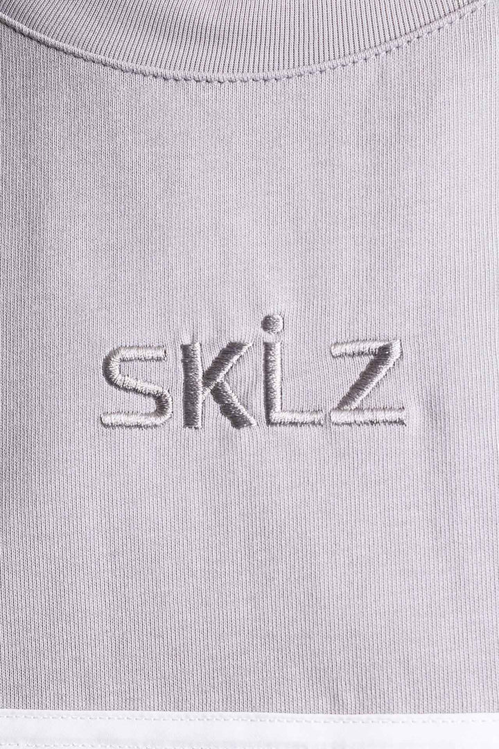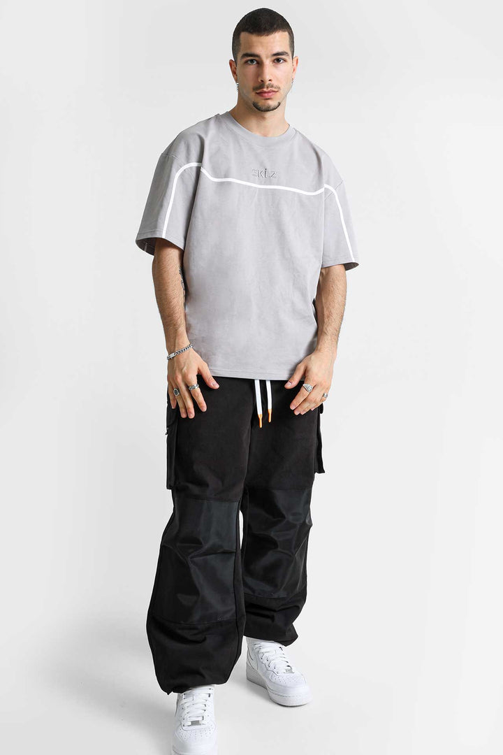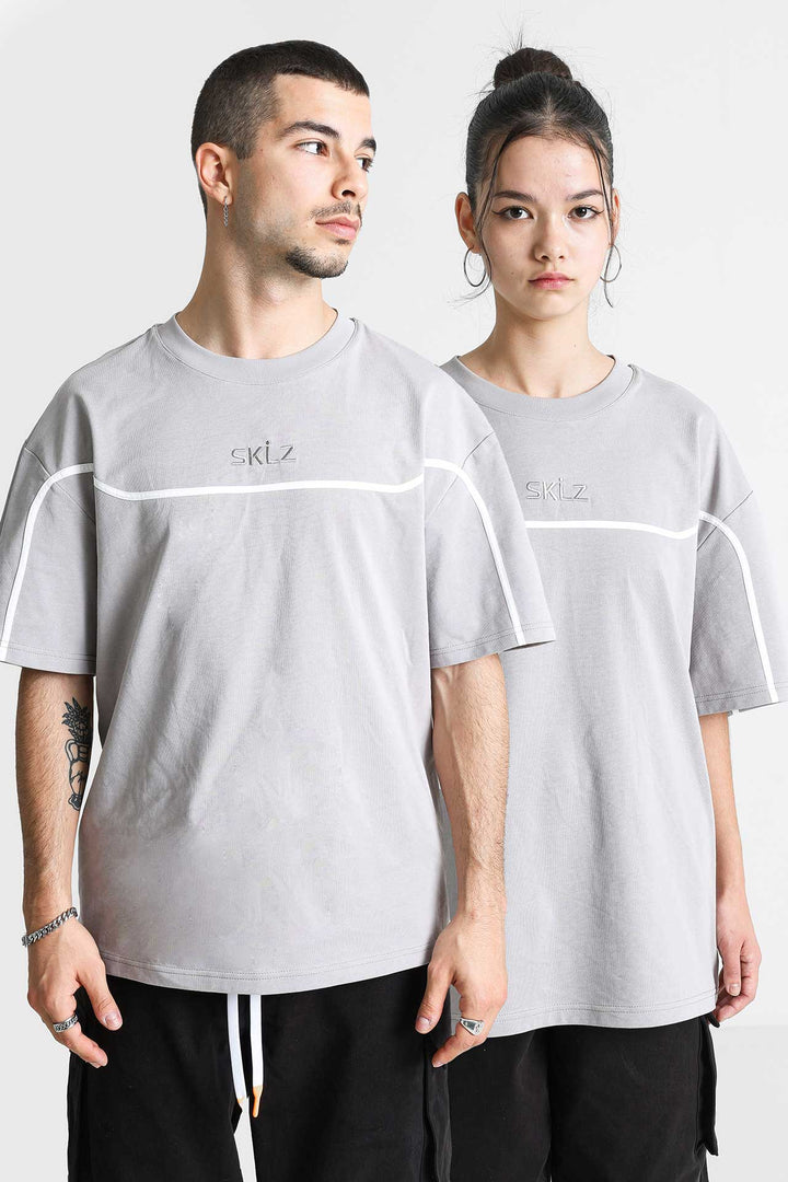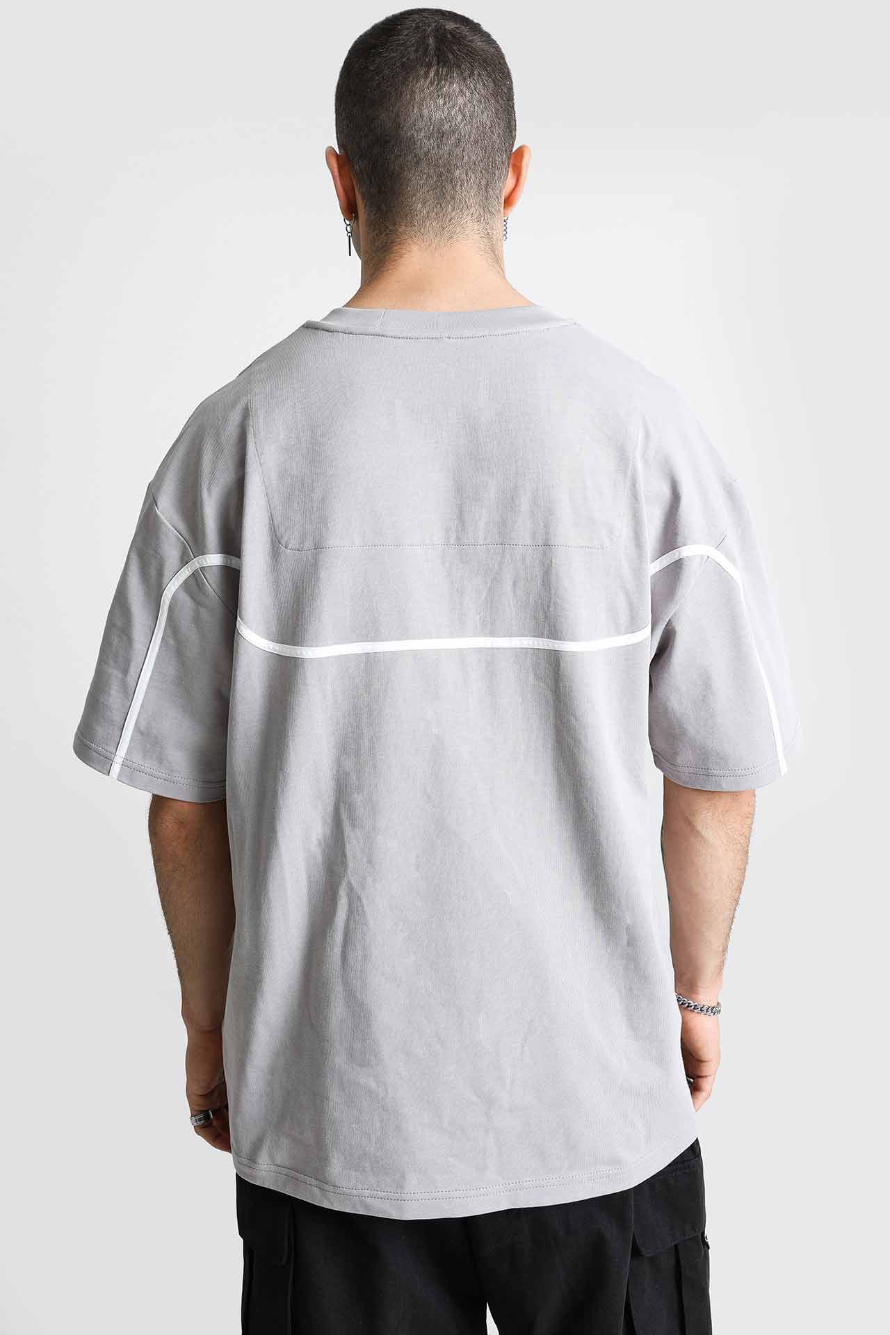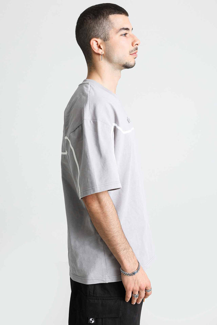 T-shirt gris à col rond, fabriqué dans un tissu épais.