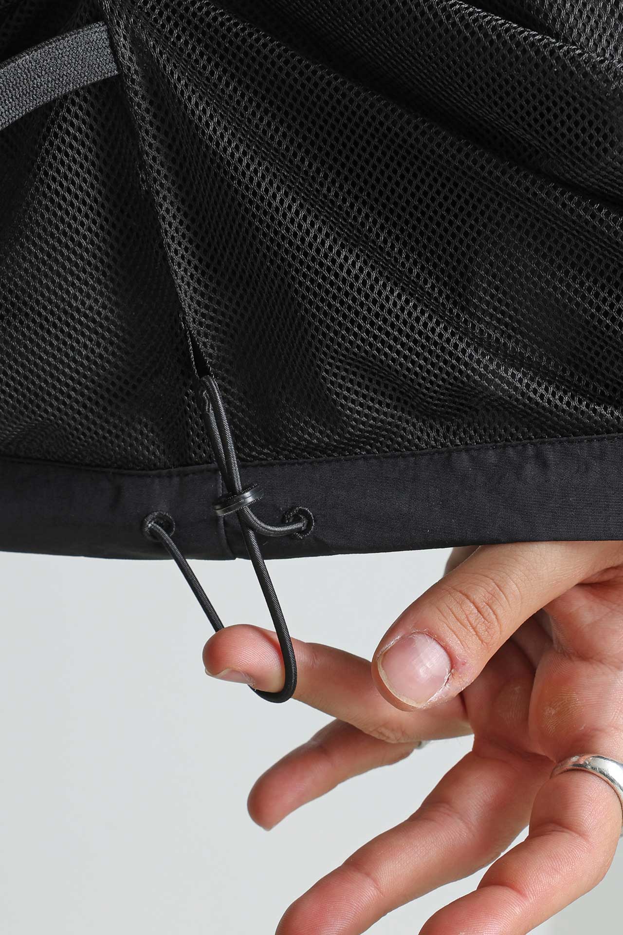 Taille ajustable avec cordon élastique de serrage. Fermeture éclair frontale, deux poches latérales zippées, trois poches sur le buste avec fermeture velcro et zip, ainsi qu'une poche intérieure sécurisée par velcro.