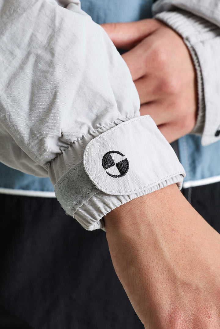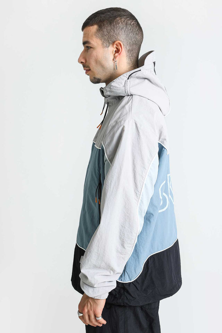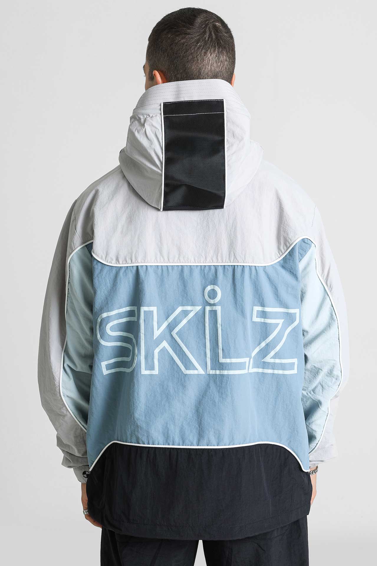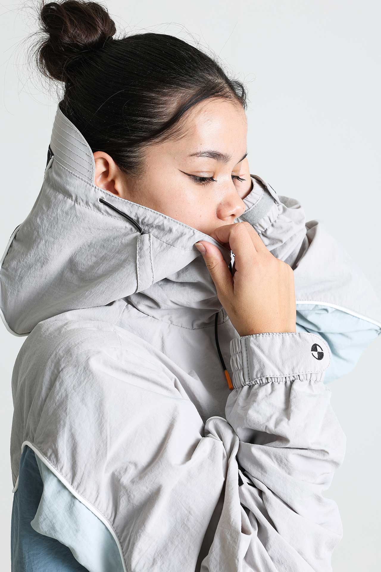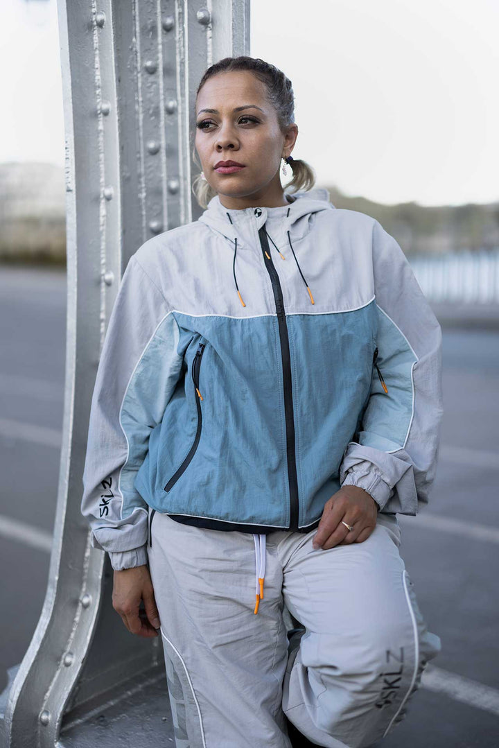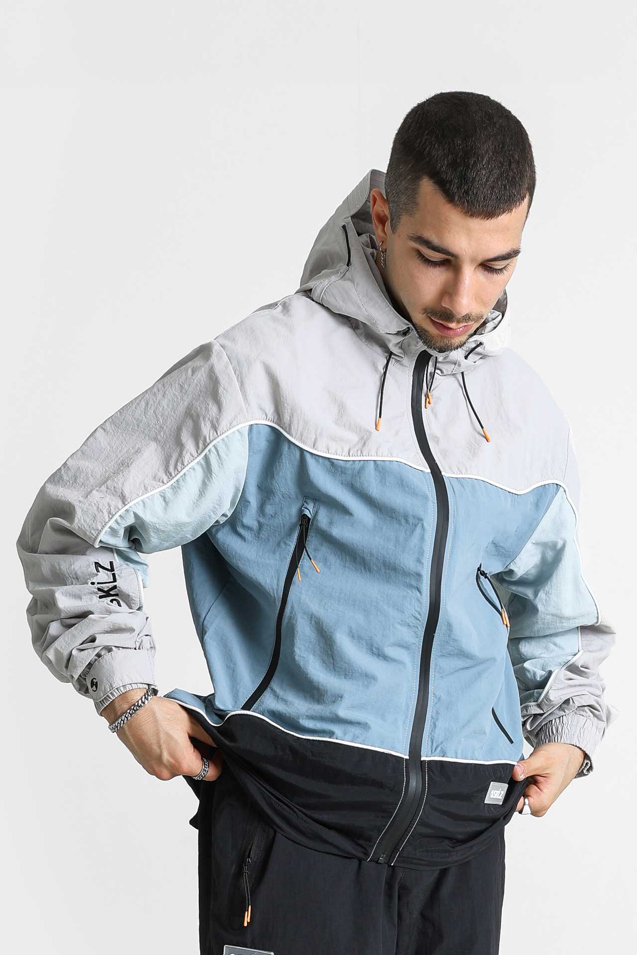 Veste de survêtement bicolore gris clair et bleu, doublée de mesh, équipée d'une capuche ajustable avec cordon élastique de serrage.